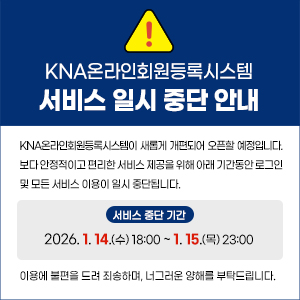 2026년 KNA온라인 회원등록 시스템 일시 중단 안내 드립니다. -KNA온라인회원등록시스템이 새롭게 개편되어 오픈할 예정입니다. 보다 안정적이고 편리한 서ㅣ스 제공을 위해 아래 기간 동안 로그인 및 모든 서비스 이용이 일시 중단 됩니다. ▶ 서비스 중단 기간 : 2026년 1월 14일(수) 18:00 ~ 1월 15일(목) 23:00 감사합니다.